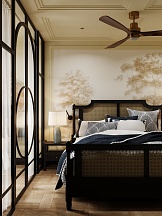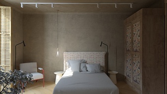 Основными элементами спальни стали высокотехнологичные кровать и матрас бренда «Сонум».