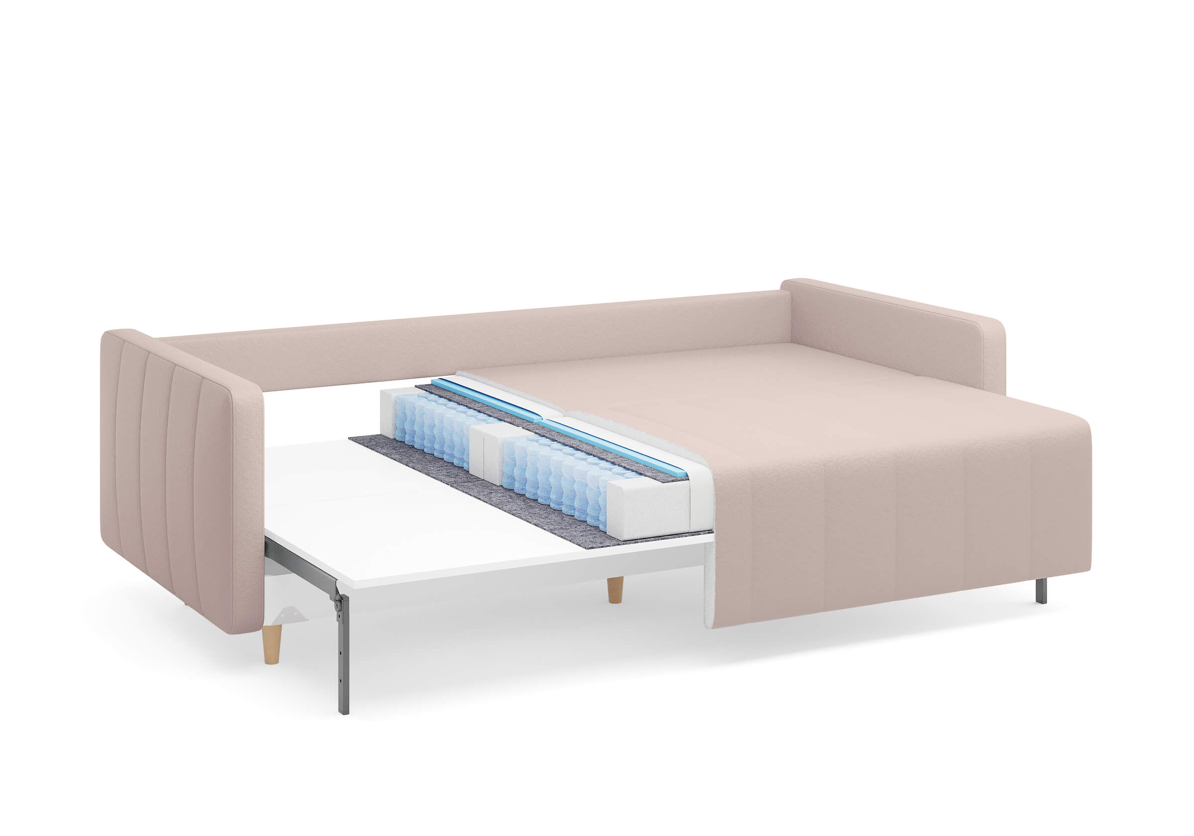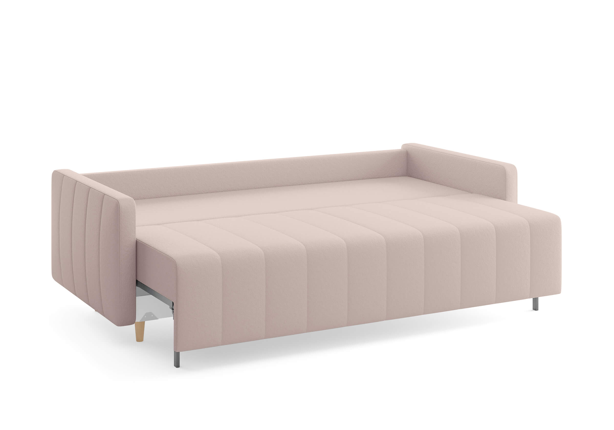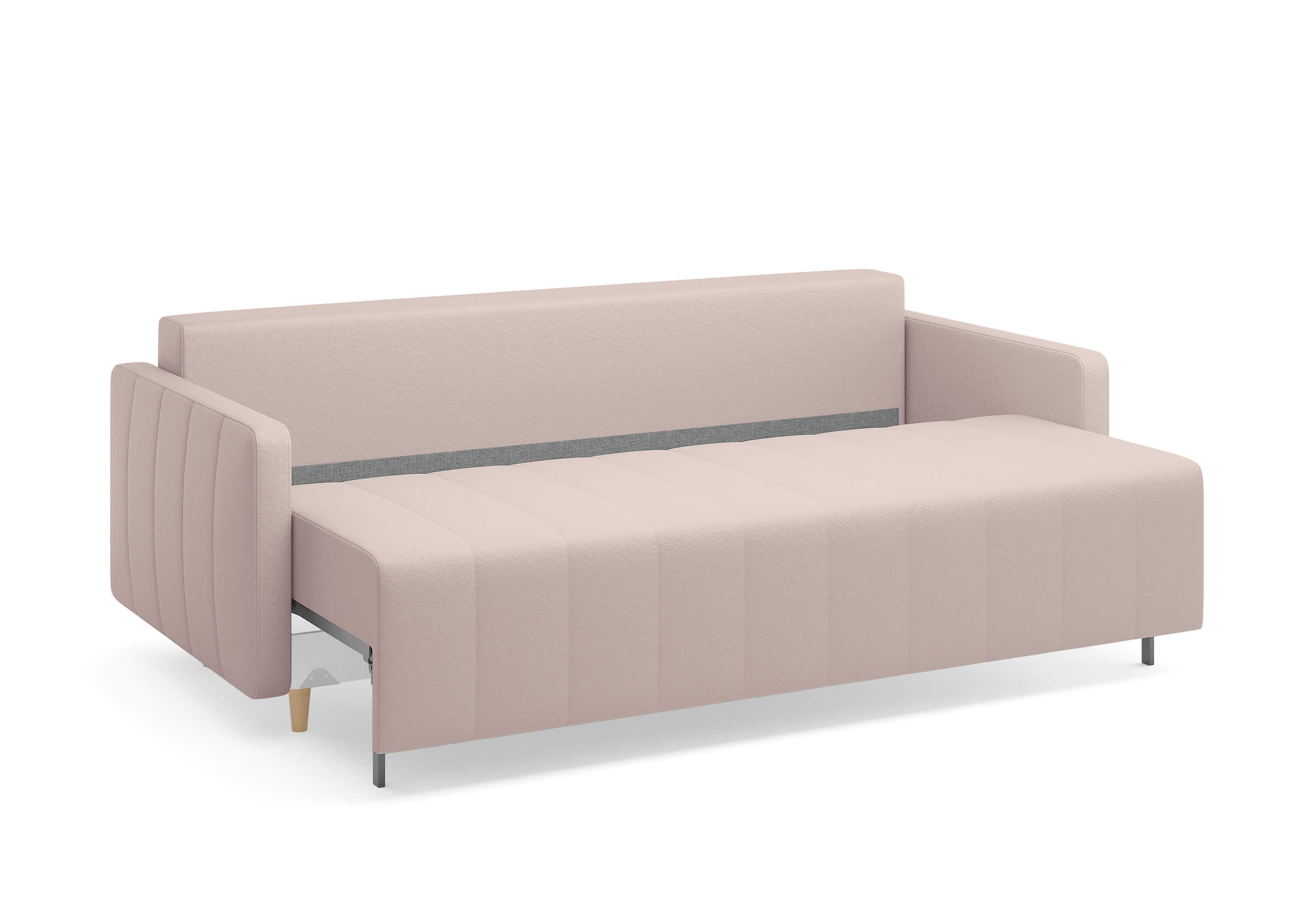 Современный дизайнерский диван с вертикальной стежкой на высоких опорах станет прекрасной частью интерьера гостиной и идеальным выбором для тех, кто ценит чистоту линий, функциональность и уют. Декоративные подлокотники придают дивану законченный вид, благодаря чему его можно разместить как у стены, так и в центре комнаты. Диван оснащён шагающим механизмом трансформации «тик-так», который сохранит напольное покрытие. В диване предусмотрен вместительный бельевой ящик для оптимального использования пространства. А матрас средней жёсткости на независимом пружинном блоке прекрасно подходит как для комфортного отдыха, так и для правильного сна