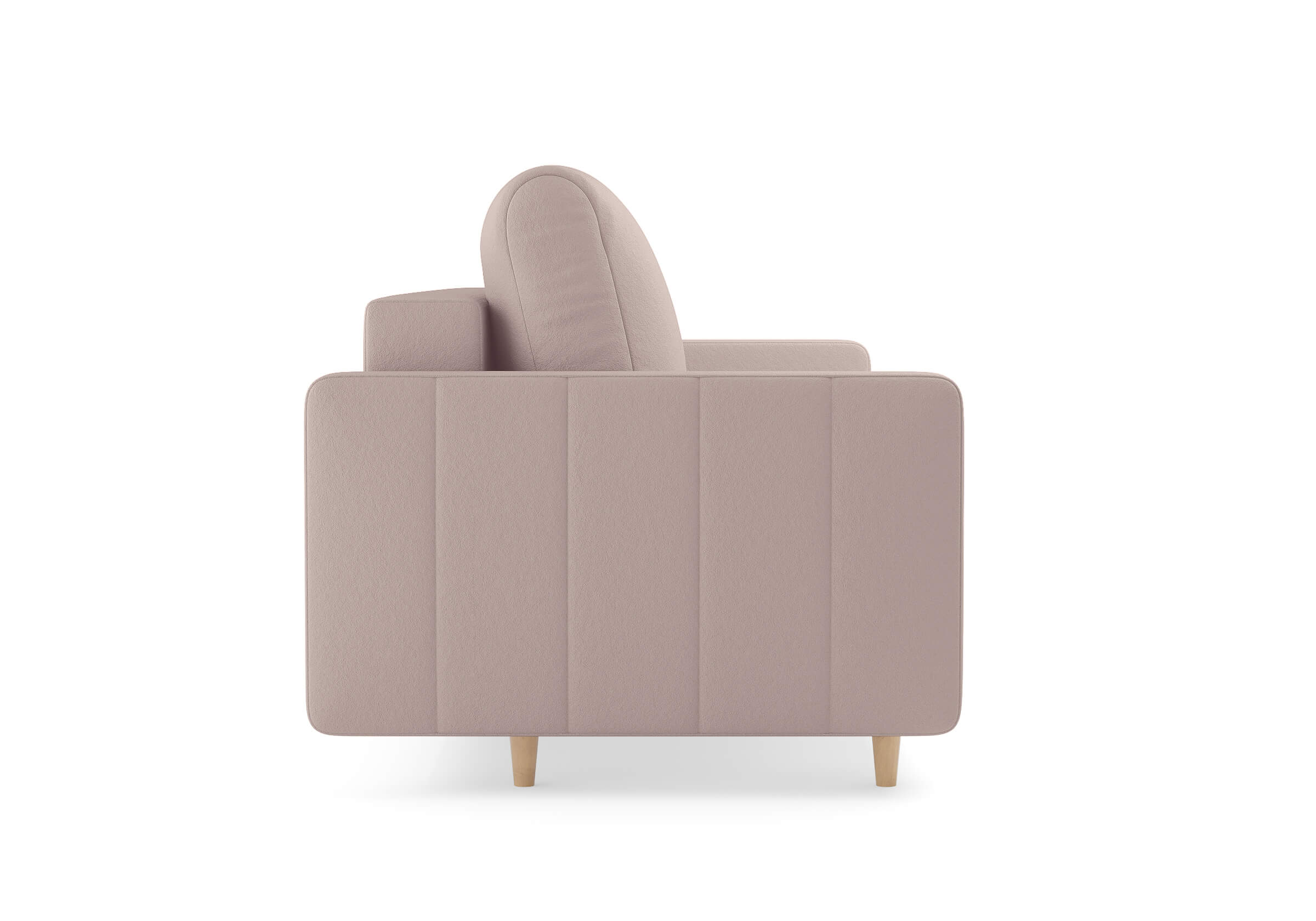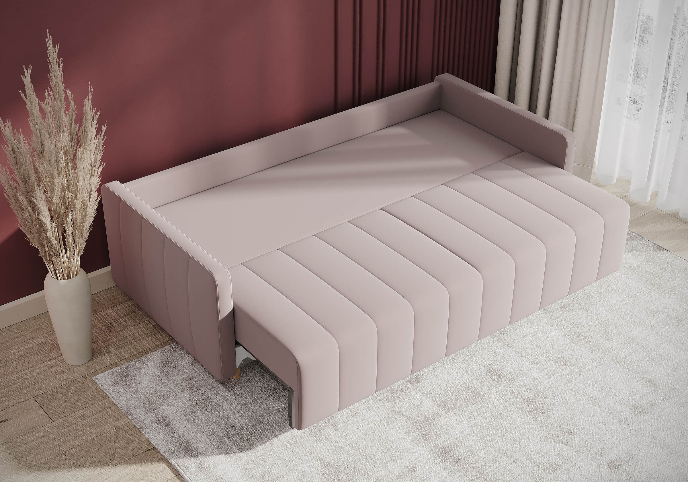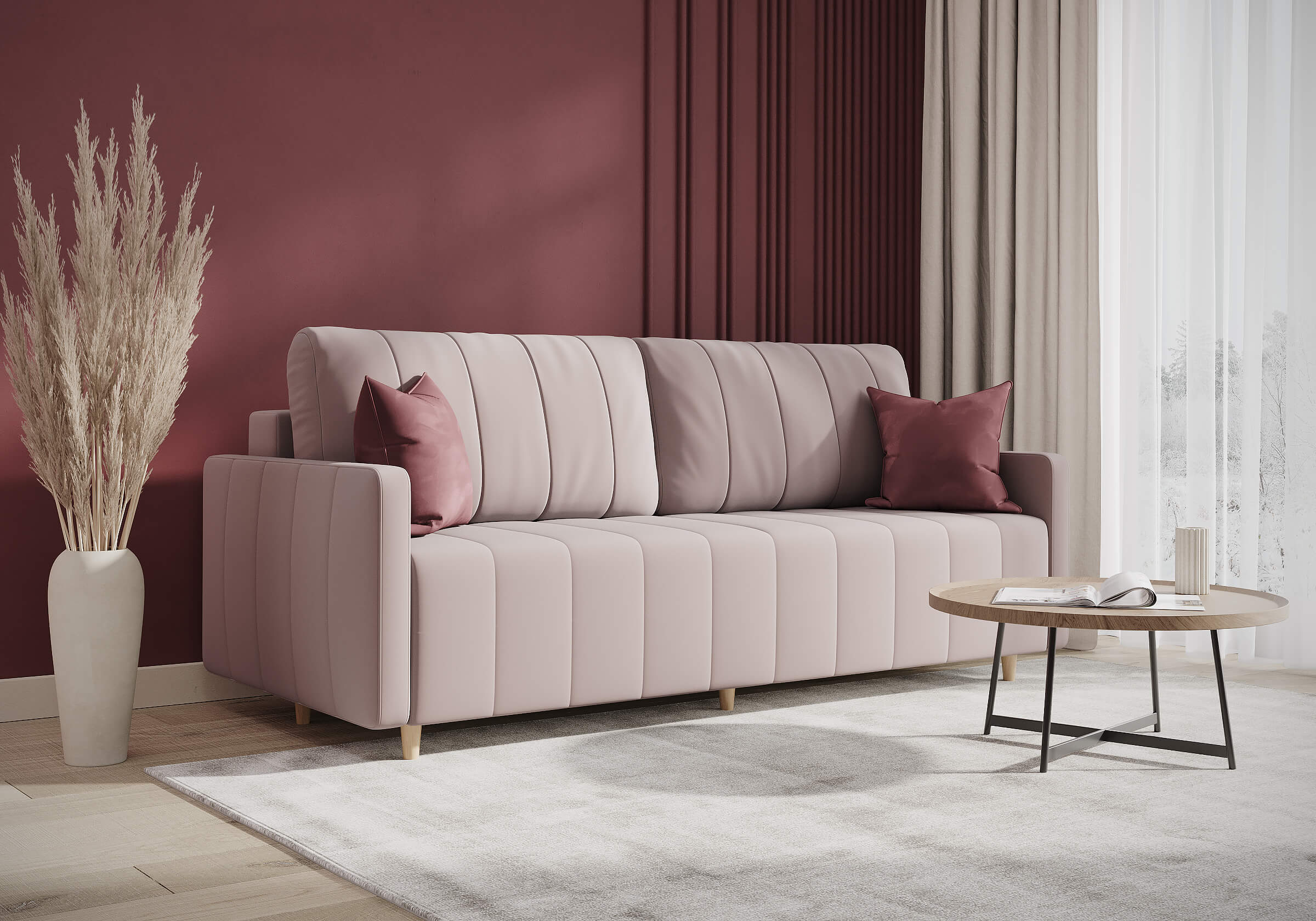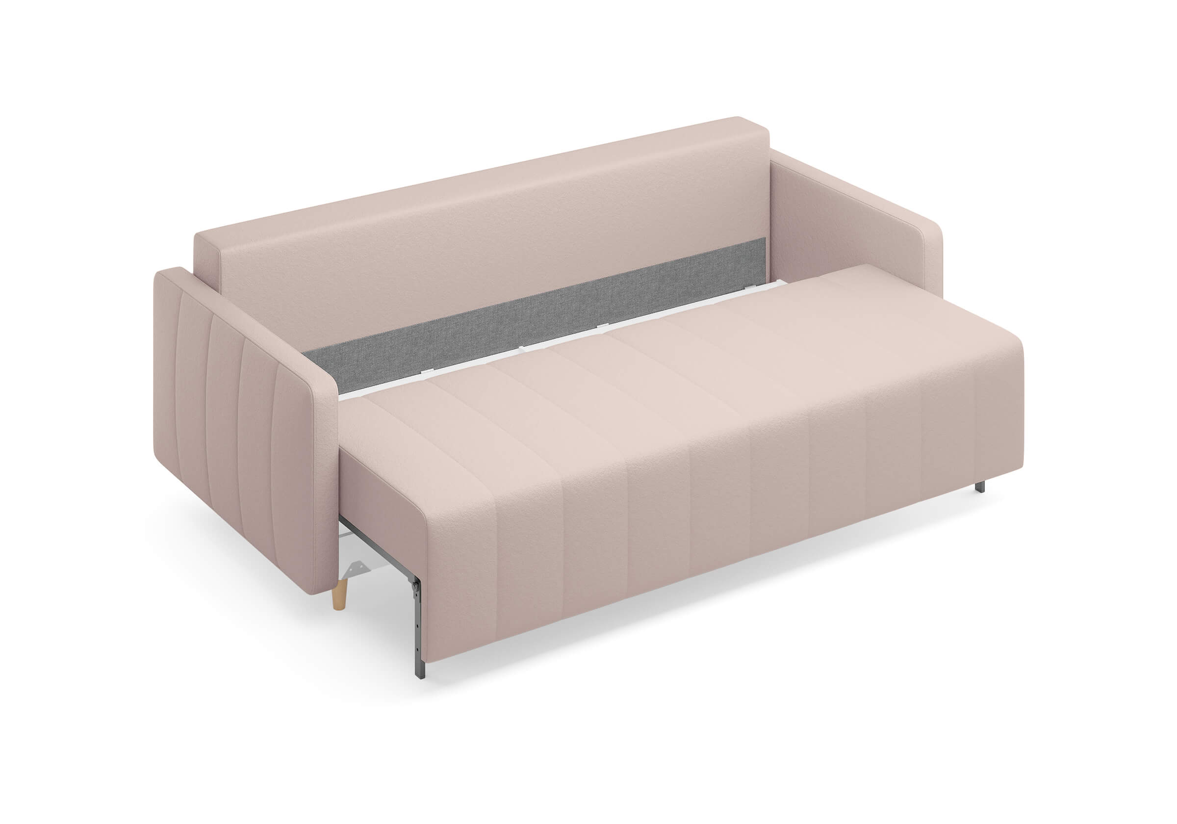 Современный дизайнерский диван с вертикальной стежкой на высоких опорах станет прекрасной частью интерьера гостиной и идеальным выбором для тех, кто ценит чистоту линий, функциональность и уют. Декоративные подлокотники придают дивану законченный вид, благодаря чему его можно разместить как у стены, так и в центре комнаты. Диван оснащён шагающим механизмом трансформации «тик-так», который сохранит напольное покрытие. В диване предусмотрен вместительный бельевой ящик для оптимального использования пространства. А матрас средней жёсткости на независимом пружинном блоке прекрасно подходит как для комфортного отдыха, так и для правильного сна