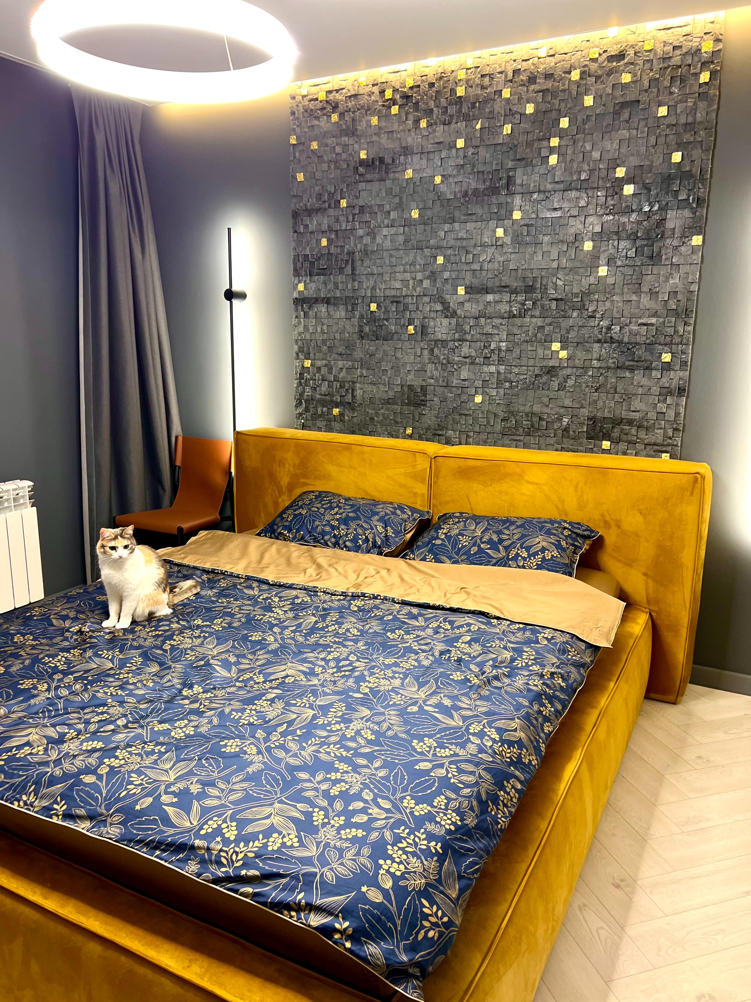 Эта серая кровать стала главным акцентом в интерьере нашей спальни! Она выглядит элегантно и стильно, а главное идеально сочетается с серебристыми обоями!