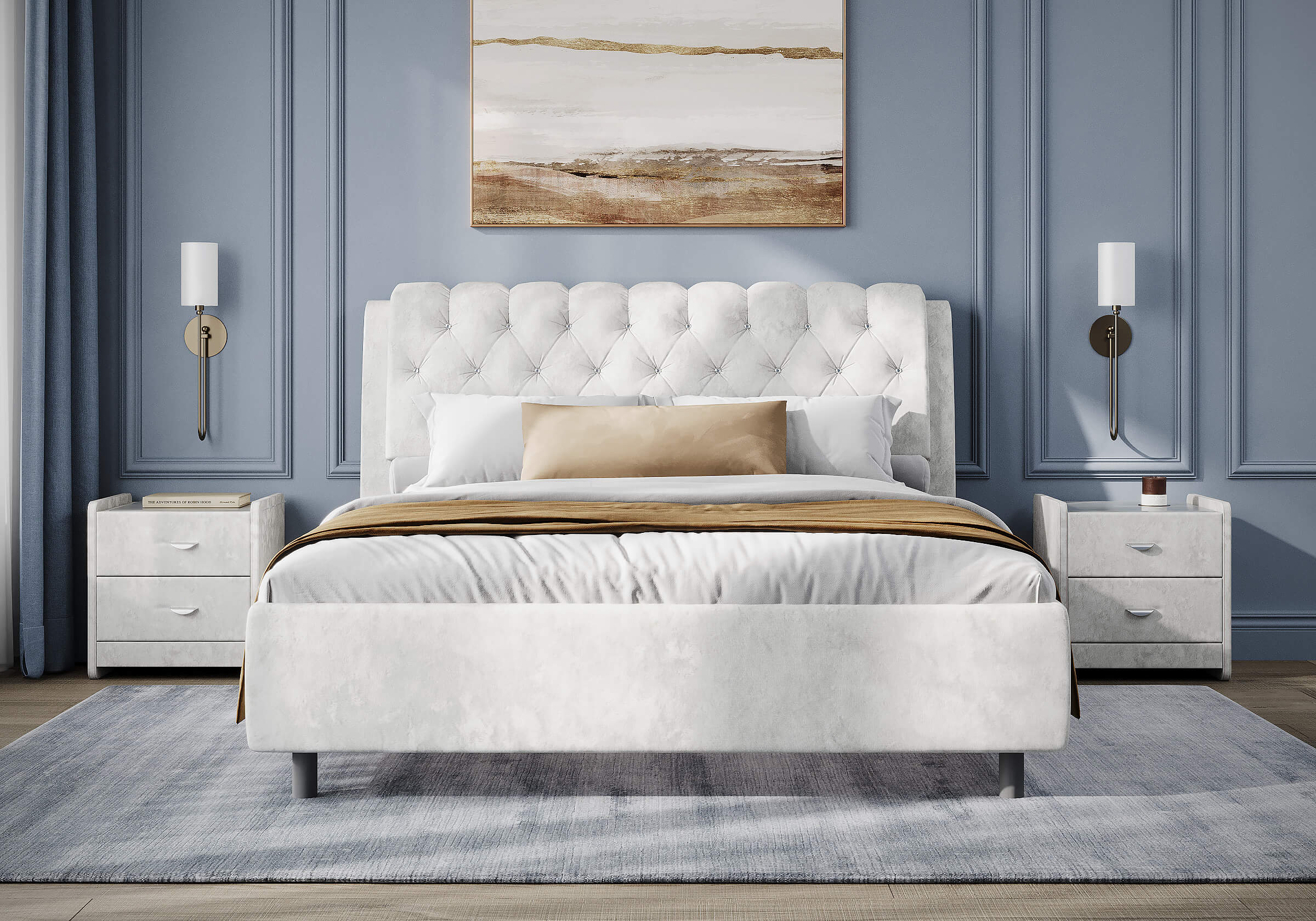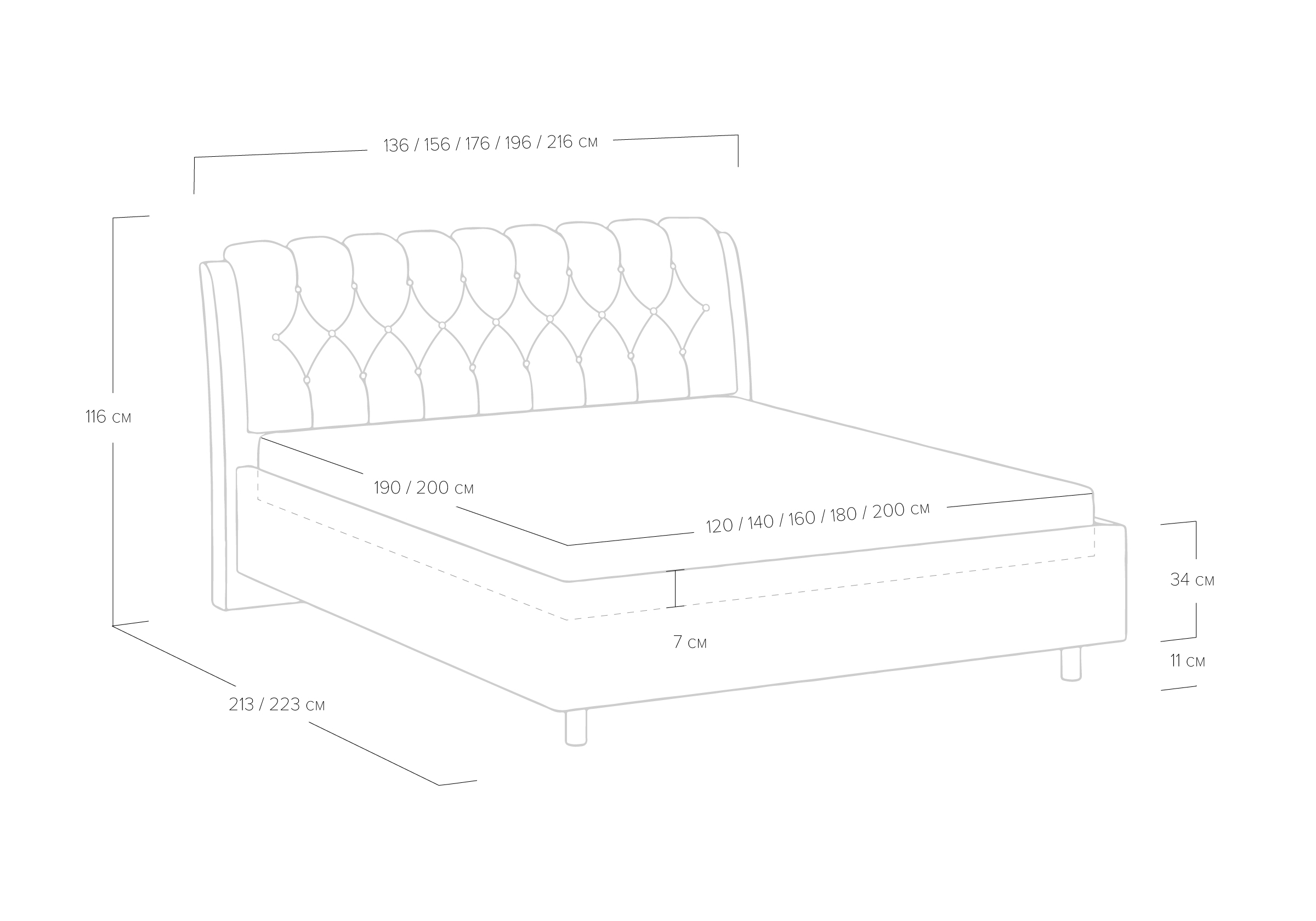 Элегантная интерьерная кровать с изголовьем, украшенным декоративными пуговицами и глубокой пиковкой. Модель изготовлена из ДСП. При необходимости кровать может быть укомплектована разборным или неразборным металлическим основанием с ламелями, подъемным механизмом с бельевым ящиком, трансформируемым основанием Aquarius.