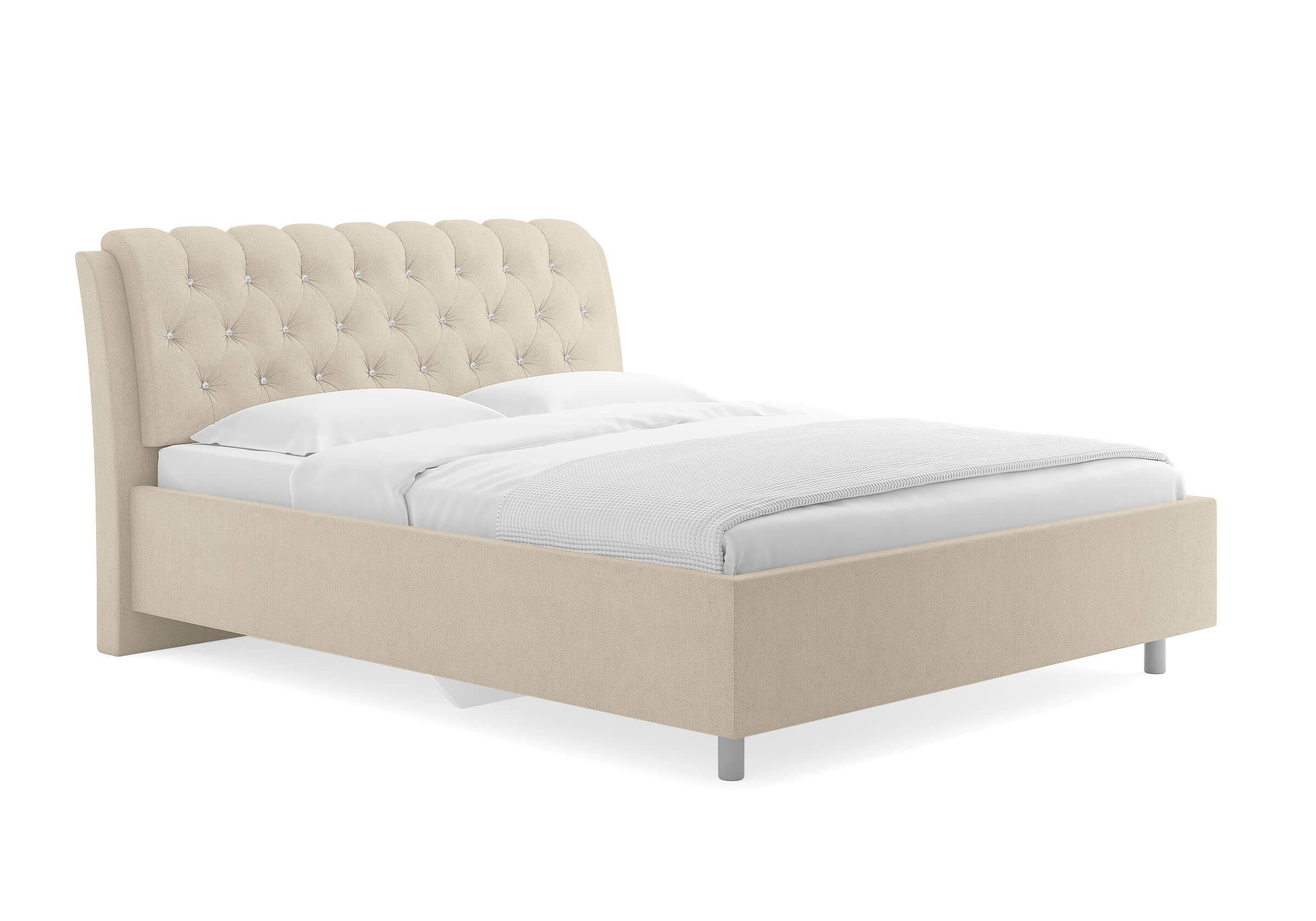 Элегантная интерьерная кровать с изголовьем, украшенным декоративными пуговицами и глубокой пиковкой. Модель изготовлена из ДСП. При необходимости кровать может быть укомплектована разборным или неразборным металлическим основанием с ламелями, подъемным механизмом с бельевым ящиком, трансформируемым основанием Aquarius.