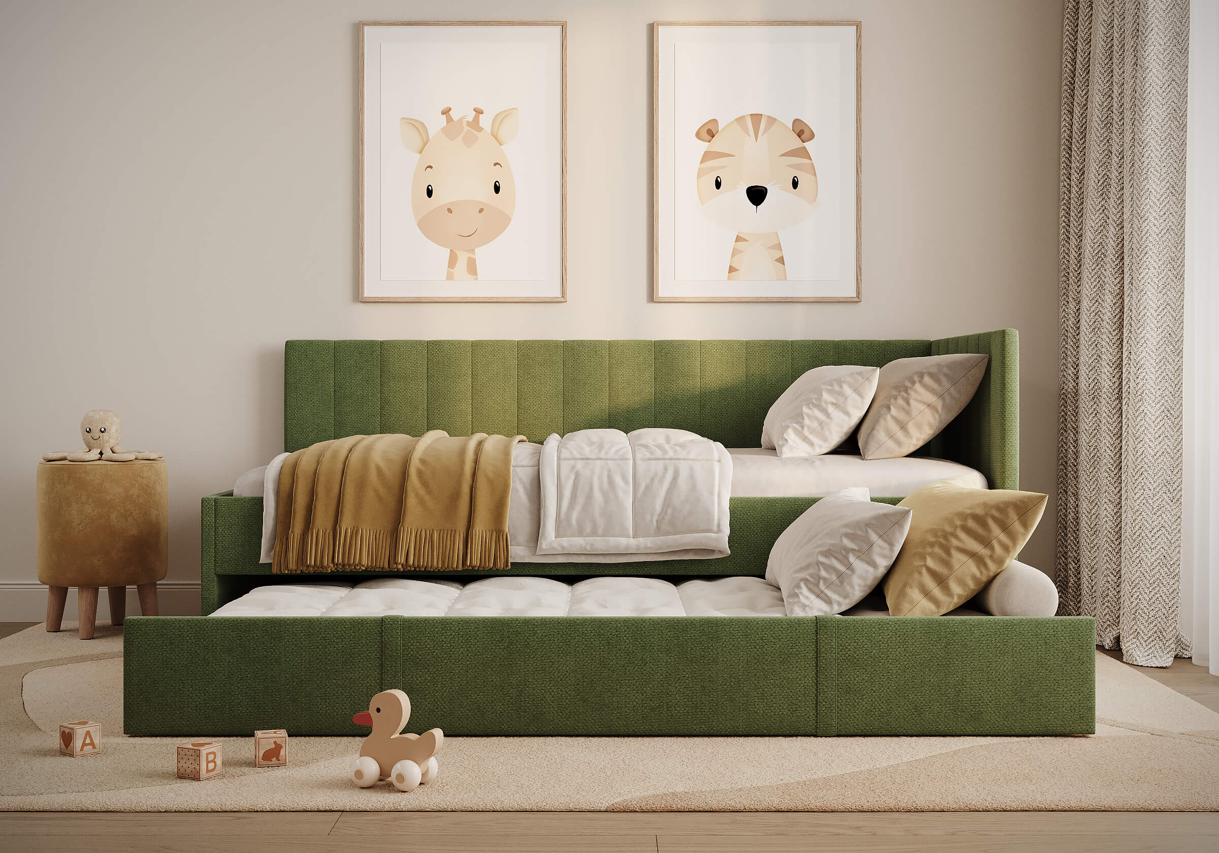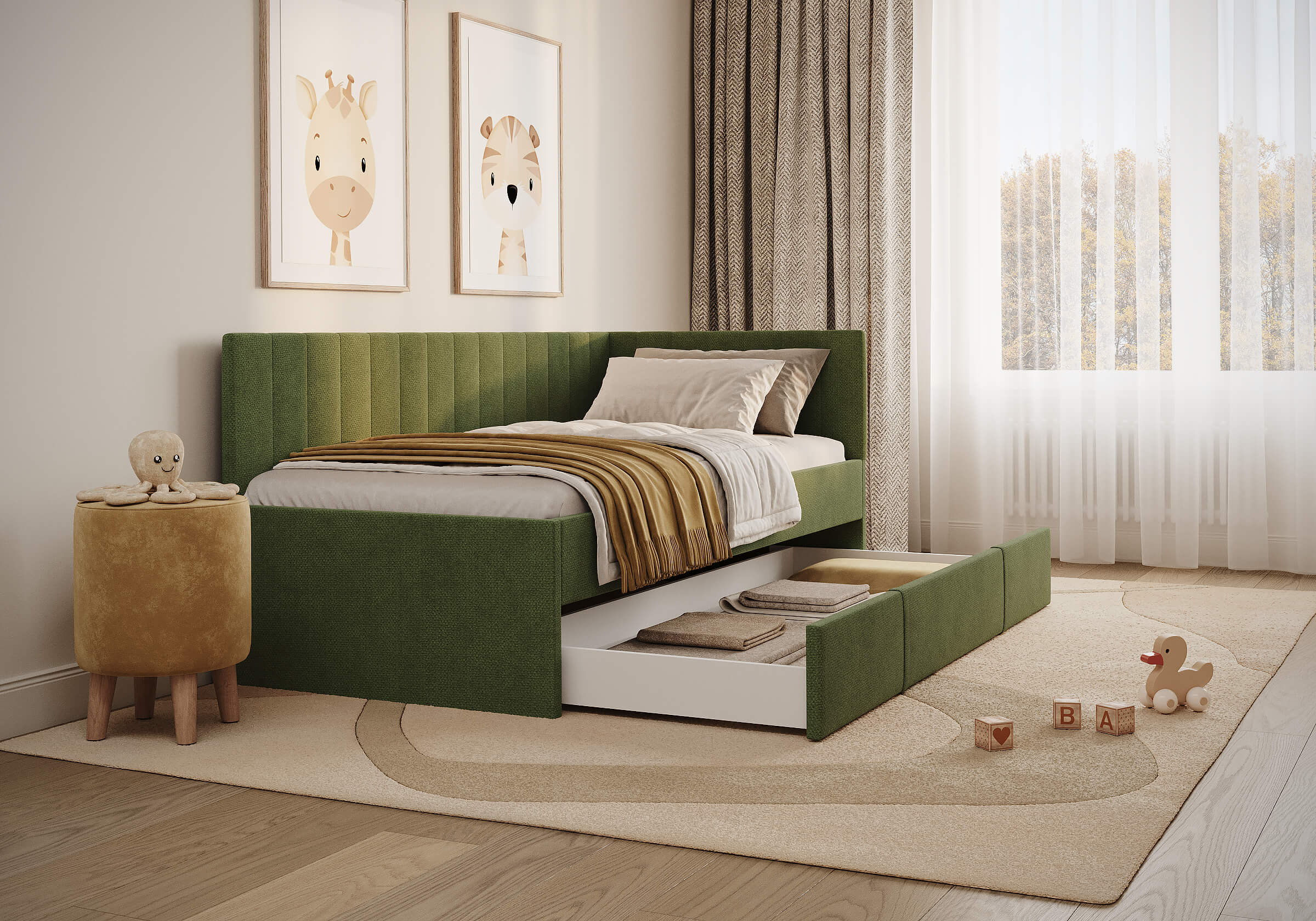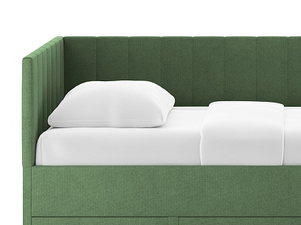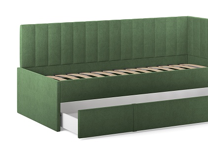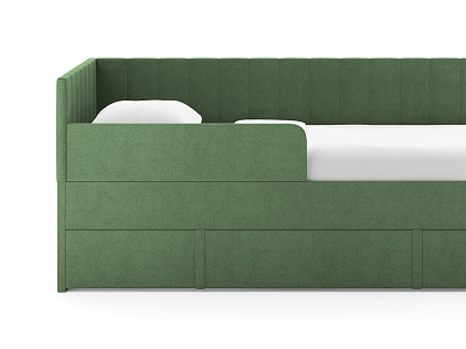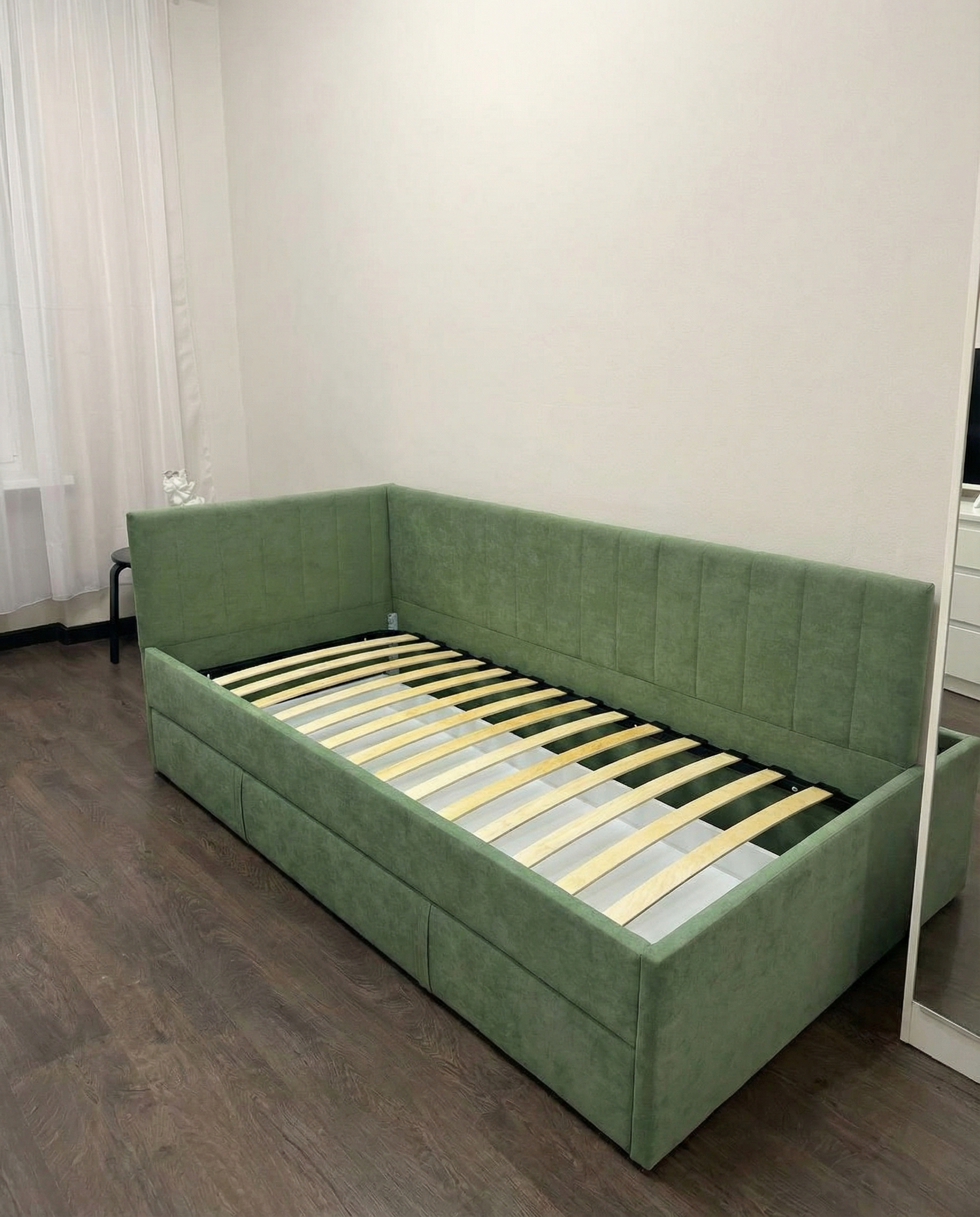 Искали детскую кровать для ребёнка и влюбились в неё с первого взгляда, когда увидели в салоне. Очень красивая ткань, приятный цвет, кровать выглядит аккуратно и стильно. Большой выдвижной ящик, выдвигается без заеданий, туда спокойно помещается постельное бельё и игрушки — он действительно вместительный. Нравится, что есть армирующие ламели: основание прочное, не прогибается, создаёт ощущение надёжности. Отличный вариант для детской, и по дизайну, и по удобству.
