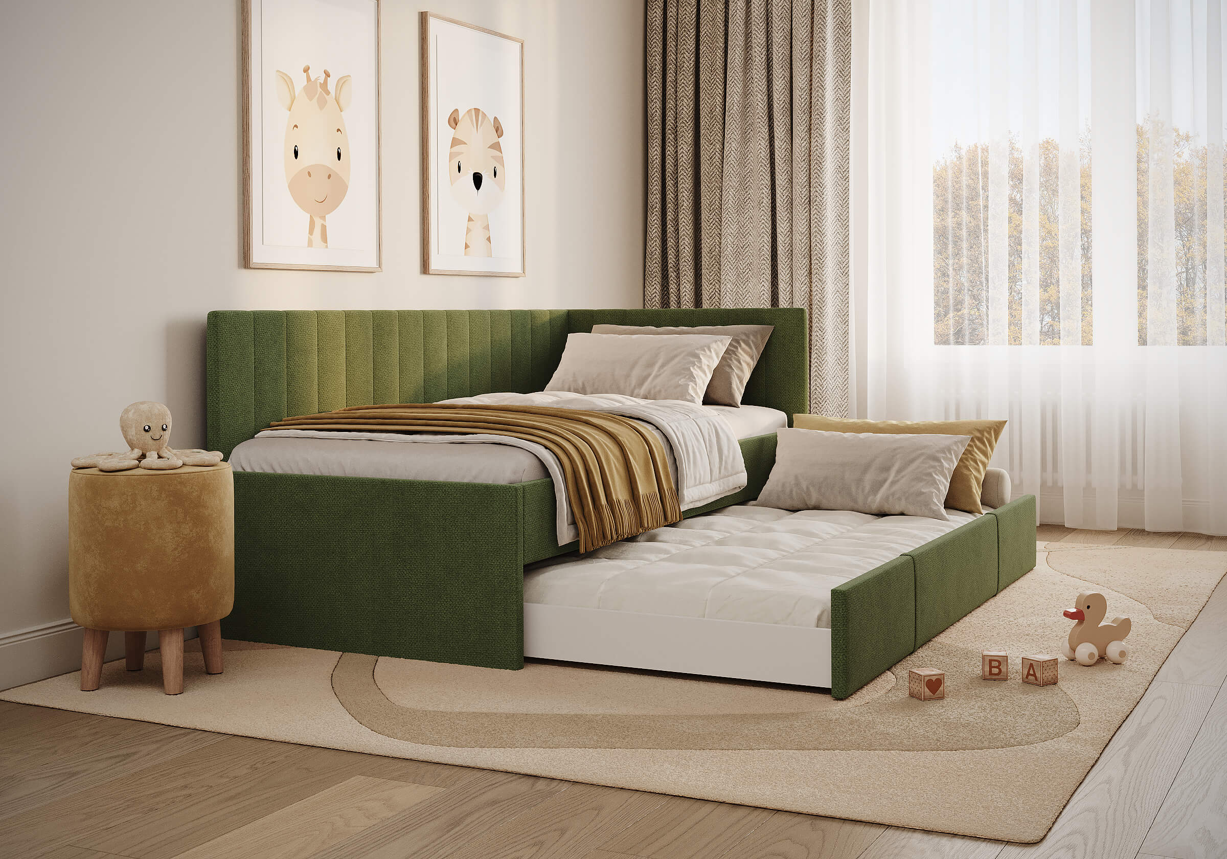 Модуль можно использовать как дополнительное спальное место или вместительный бельевой ящик. Выдвигается полностью для обеспечения уборки под кроватью.